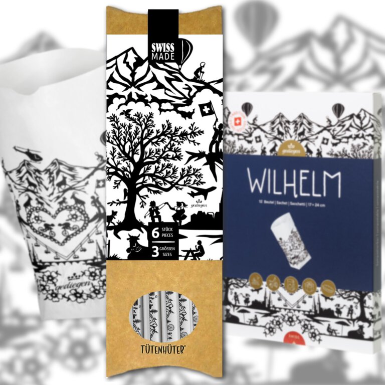 La elegante bolsa de papel "Wilhelm" puede cerrarse fácilmente con un Tütenhüter. La conocida silueta digna también queda de maravilla en el Tütenhüter. Y los temas, por supuesto, no son una coincidencia. Sandra baila en la pista, Chrigi regresa al valle de una excursión de esquí y ambos encuentran la fuerza en el silencio.